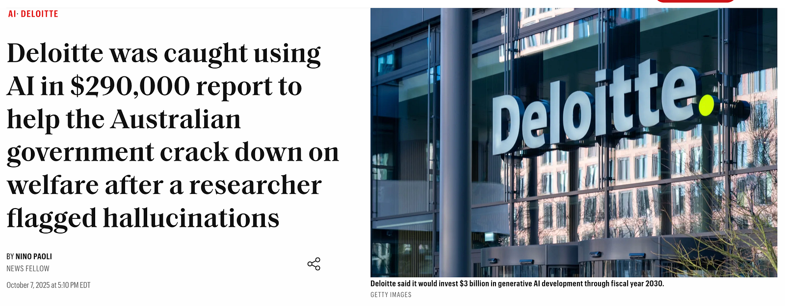 But then I remembered the Deloitte story that had broken that morning. They’d submitted a $440k government report full of fabricated citations and invented quotes — the byproduct of an ever-hallucinating, overeager AI assistant. I asked if he’d seen the headline.